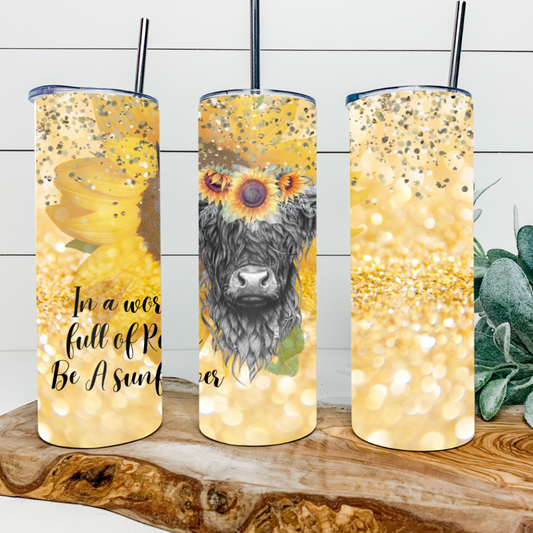 20 OZ Skinny Tumbler Highland Cow In a world full of Roses be a Sunflower